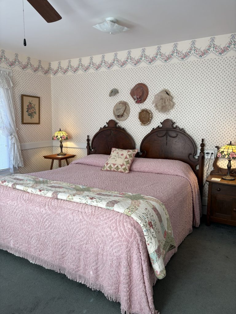 Grandma’s Attic is a quaint upstairs room with a king size bed and private bathroom across the hall with shower.  Also contains a mini fridge.
